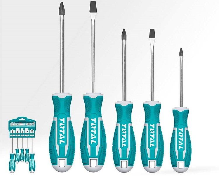 Bộ 5 cây tua vít dẹp, bake đa năng TOTAL THT2506052 là bộ tua vít 5 chi tiết có thể sử dụng để tháo lắp hầu hết các thiết bị trong gia đình