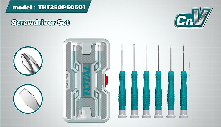 Bộ 6 cây tua vít chuyên dụng sửa đồng hồ TOTAL THT250PS0601 có 6 cây tua vít nhỏ gọn với kích thước khác nhau SL2.0 * 50, SL2,5 * 50, SL3.0 * 50, PH000 * 50, PH00 * 50, PH0 * 50