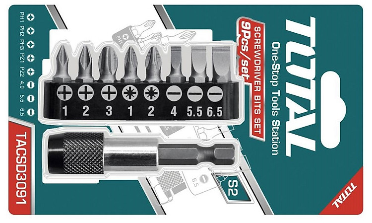 Bộ 9 mũi bắt vít thép chuyên dụng S2 TOTAL TACSD3091 có 8 đầu vít nhỏ gọn chuyên dụng làm từ thép công nghiệp S2 và 1 đầu giữ mũi vít