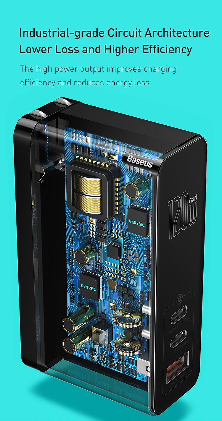 GaN là công nghệ vật liệu bán dẫn được áp dụng cho các loại thiết bị sạc mới hiện nay, công nghệ vật liệu này mang tính đặc trưng như: chịu được nhiệt độ cao, kháng bức xạ, nâng cao công suất, truyền dẫn nhanh lại siêu gọn nhẹ. Chính vì thế, các loại củ sạc trang bị công nghệ này thường có khả năng sạc nhanh 5x so với các loại sạc thường và khả năng chuyển hóa cực cao lại tiết kiệm diện tích với thiết kế nhỏ hơn đến 70%.