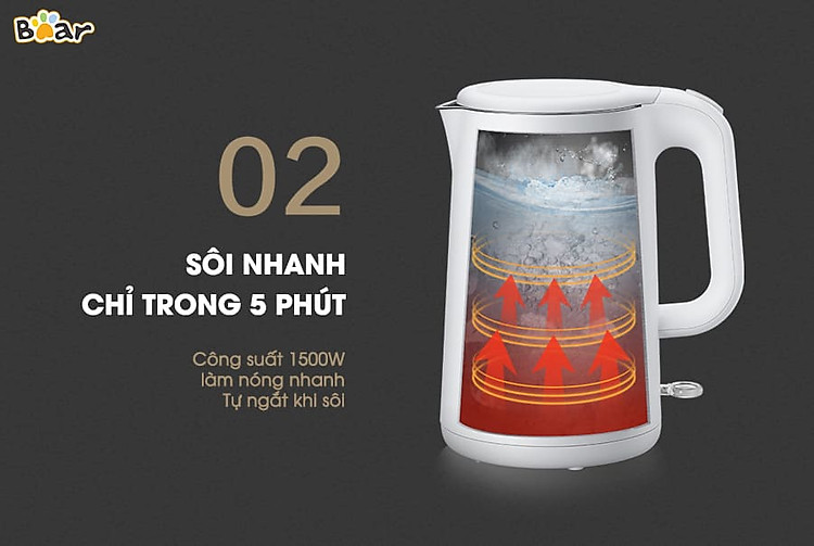 Ấm siêu tốc BEAR ZDH-Q17B1 1.7L có thiết kế 5 lớp: Lớp vỏ sơn tĩnh điện chống bỏng Lớp lõi inox 304 sáng bóng, không gỉ