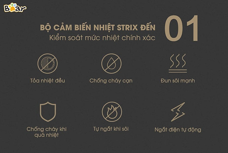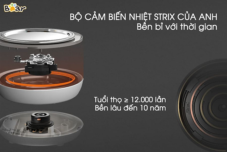 Bộ cảm biến nhiệt Strix của Anh tăng độ bền cho ấm siêu tốc Bear lâu gấp 12000 lần (đến khoảng 10 năm sử dụng).