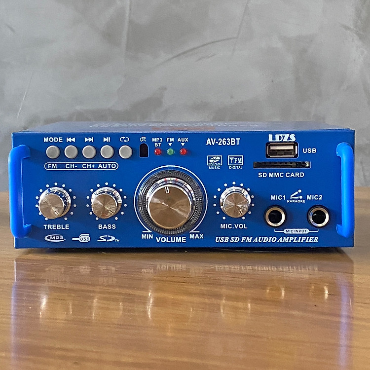 người sử dụng có thể ghép máy với loa có micro để hát karaoke có sẵn echo tích hợp khá tiện dụng, vô cùng tiện lại, như mang đi picnic giải trí để có những giây phút giải trí bên người thân. Bên cạnh đó, amply karaoke AV-263BT còn có khả năng lọc tạp âm, điều chỉnh âm thanh sao cho đầu âm thanh ra được chất lượng nhất, tuỳ vào mong muốn của người sử dụng. - Amply mini AV-263BT tích hợp bluetooth, dễ dàng kết nối, sử dụng an toàn.