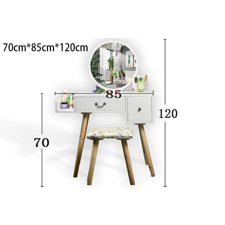 Gương tròn và chân ghế kiểu Bắc Âu. Tích hợp rất nhiều ngăn kéo đẩy .