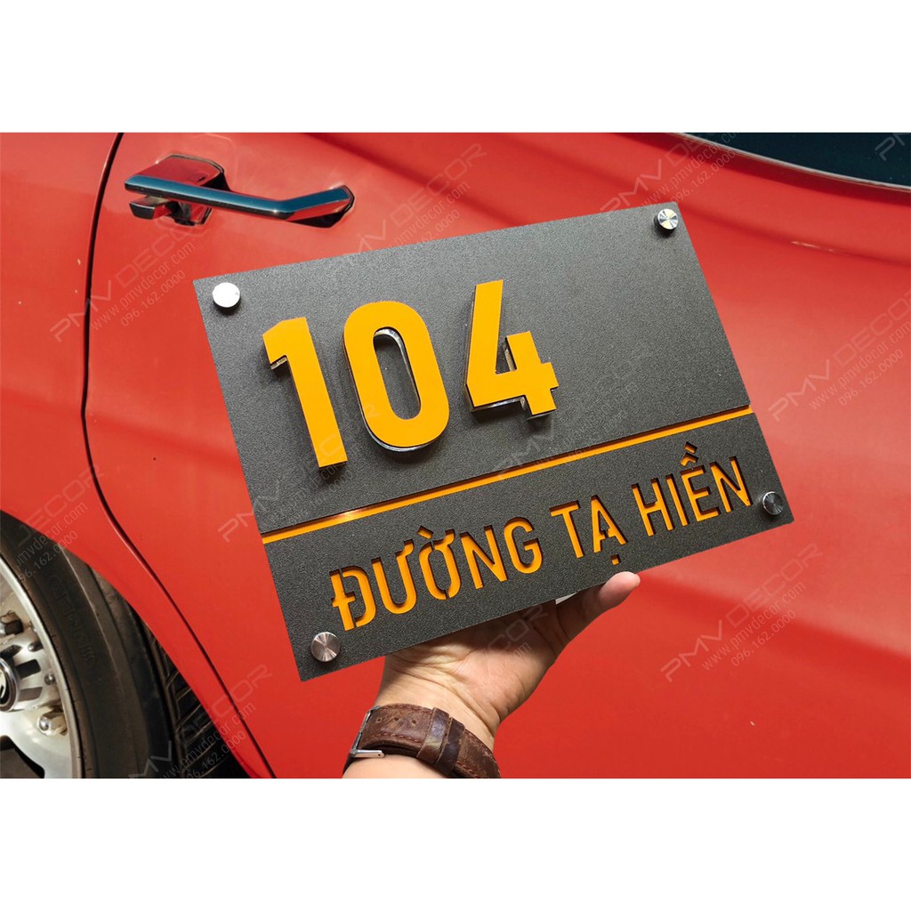 Giới thiệu BẢNG, BIỂN SỐ NHÀ. Alcorest màu vàng Hội An + Mica ghi sần, số nổi 1cm đế mica trong 1cm, ngoài trời. BSN-PMV158