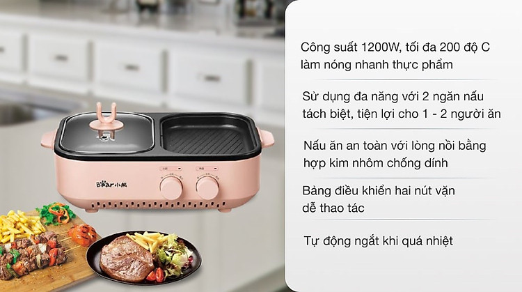 Bếp lẩu nướng đa năng Bear DKL-C12D1 là thiết bị nấu ăn thật đơn giản, thông minh và tiện lợi, thay thế cho cả bếp gas, nồi chảo thông thường để đáp ứng cho nhu cầu nấu ăn đơn giản của 1 - 2 người.
