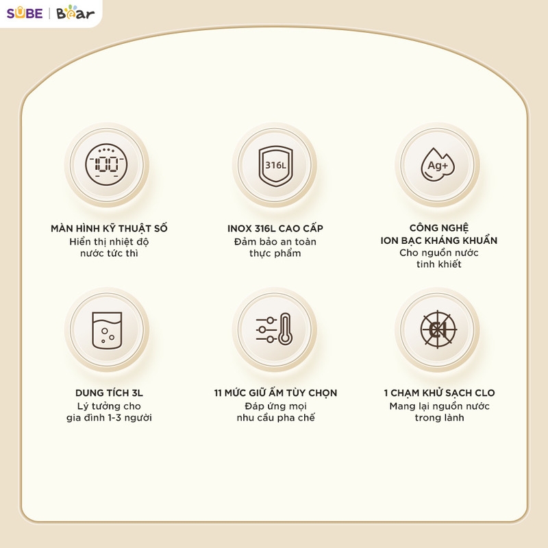 Đun sôi – Boiling Water: Đun sôi nước, sau khi hoàn thành tự động chuyển sang trạng thái giữ ấm. Chỉ cần vài phút, bạn đã có ngay 3 lít nước sôi để pha trà, pha mì hay pha sữa.