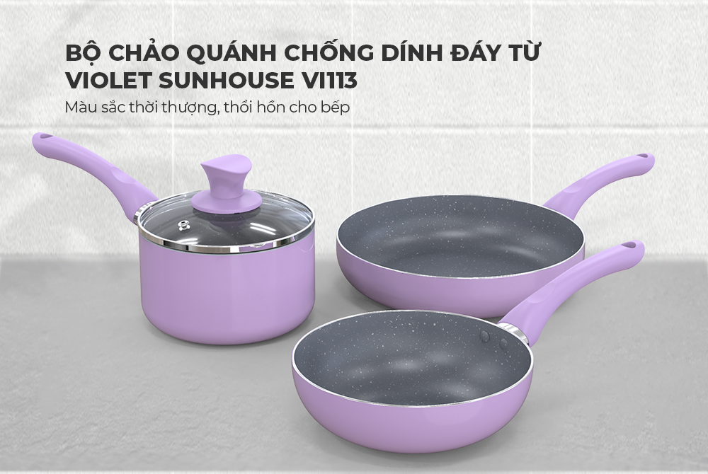 Bộ chảo quánh chống dính đáy từ VIOLET SUNHOUSE VI113 có thiết kế hiện đại với màu tím tươi tắn cùng lớp chống dính xám đá tạo nên vẻ đẹp thời thượng, thổi hồn cho căn bếp hiện đại, tạo cảm hứng nấu ăn cho gia đình.