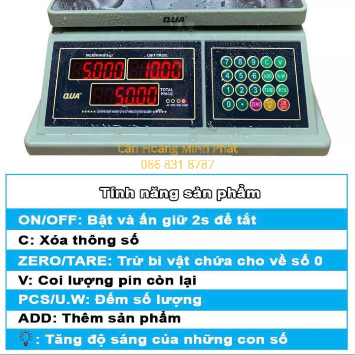 | Hướng dẫn sử dụng | Khả năng chống nước tuyệt đối, hoạt động tốt trong môi trường ẩm ướt. Thích hợp để cân Hải Sản, Thủy Sản, ...Chức năng chính: cân, tính tiền, trừ bì, cồng dồn, đếm số lượng, kiểm tra pin, ...Chống nước tuyệt đốiĐơn vị: kg, gChức năng: On/ Off: Để tắt/ mở0-9: nhập số tiềnV: xem pin “nếu 4 là bình thường, 3 thì yếu pin cần sạc”. Trên 4.27 là pin khỏeBÓNG ĐÈN: chỉnh độ sáng ledADD: cộng dồn và xem cộng dồnC: xóa số tiền đã nhập, xóa cộng dồnPCS: chức năng đếm mẫuTARE: trừ bìZERO: trở về màn hình “0.000” ban đầu.Khả năng chống nước: Sử dụng tốt trong môi trường nước |