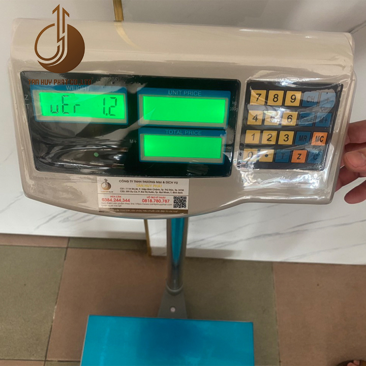 Hiển thị: Màn hình LCD 6 số đen nền xanh. Hiển thị: Khối lượng, Đơn giá, Thành tiền.
