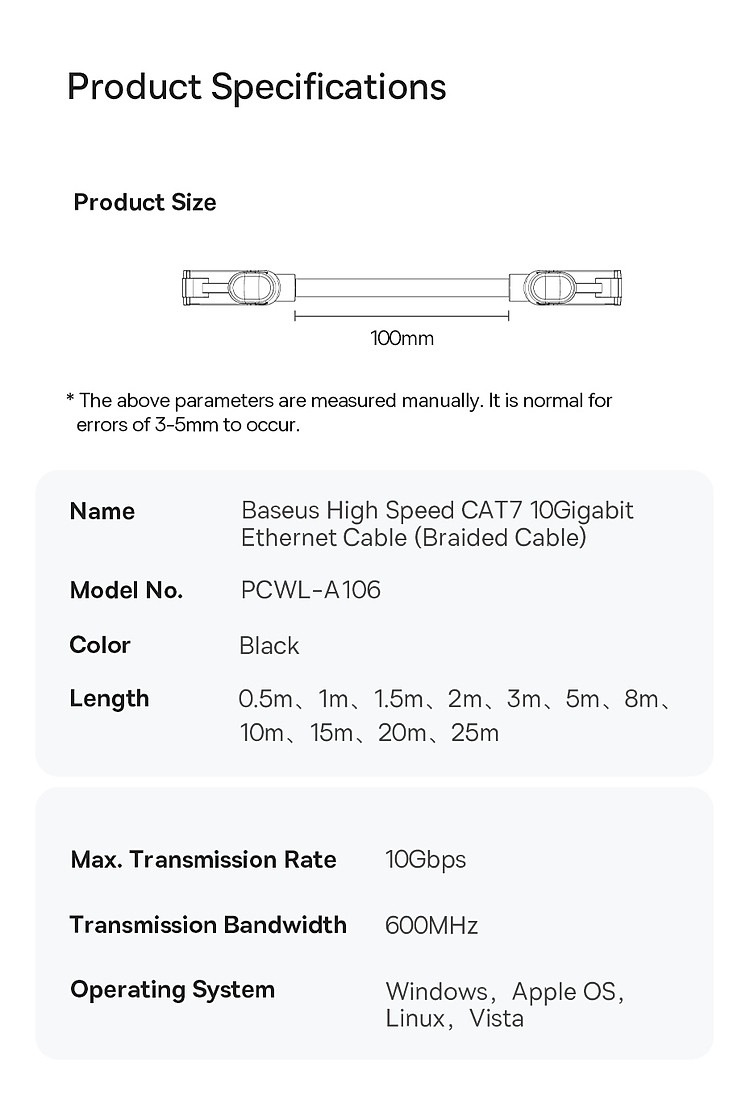 | Tên | Cáp Mạng Lan 2 Đầu Baseus High Speed CAT7 10Gigabit Ethernet Cable (Cáp dây dù) |