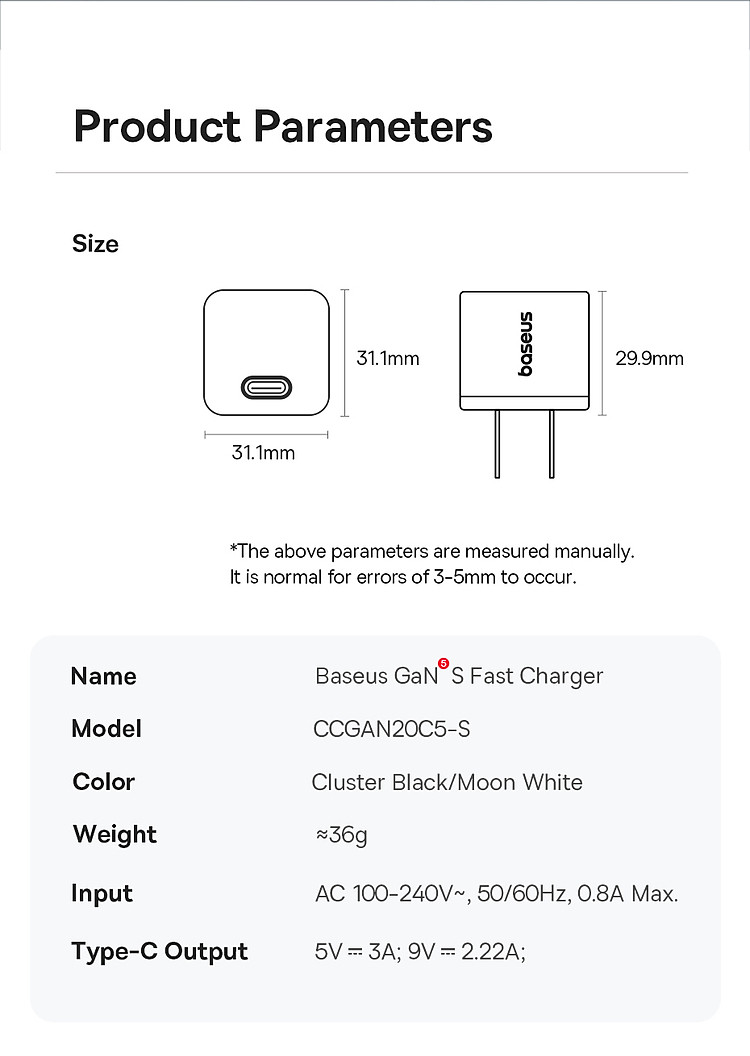 | Type-C Output | 5V-3A, 9V-2.22A |