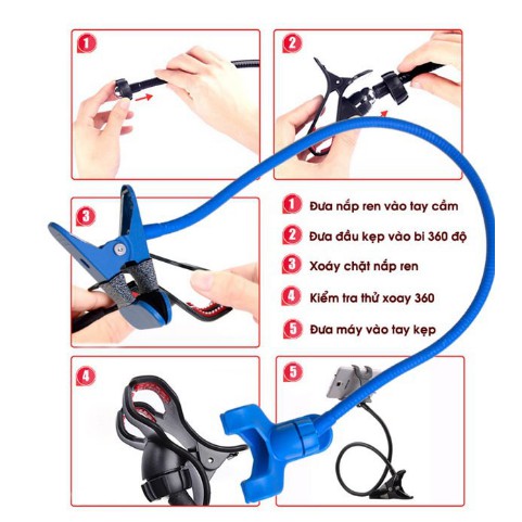 🍀 Bộ sản phẩm bao gồm chân kẹp nhựa, tay cầm có thể uốn dẻo bằng kim loại bọc nhựa, bi xoay 360 độ, đầu kẹp điện thoại và nắp ren bằng nhựa bền đẹp có thể kẹp vào đầu giường, thành ghế, thành bàn... một cách chắc chắn có thể giữ an toàn cho điện thoại tránh bị rơi vỡ khi sử dụng.