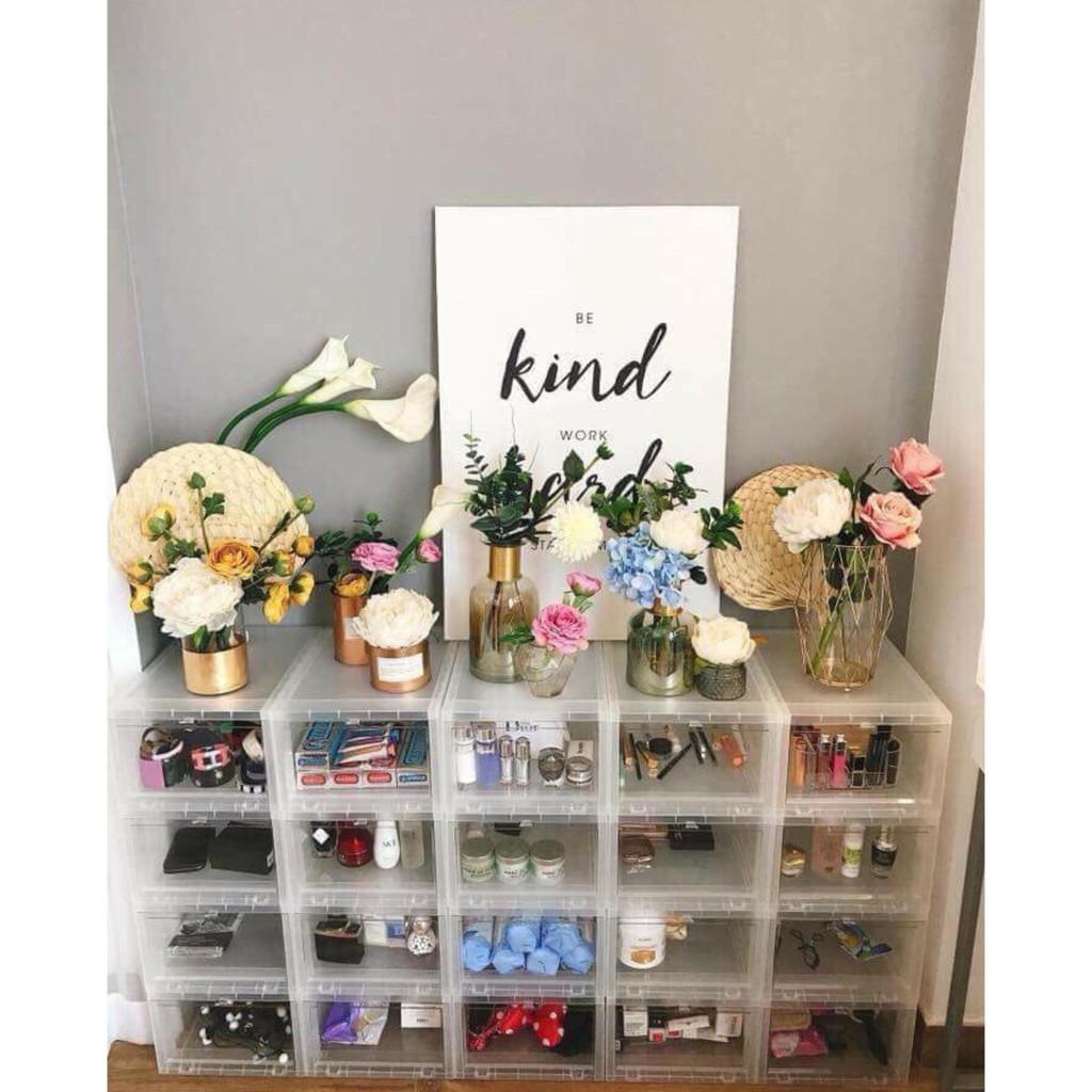 Hộp giày trong suốt có nắp đóng mở nên bạn dễ dàng thấy được những đôi giày trong hộp và giúp bạn dễ dàng khi lấy ra dùng.