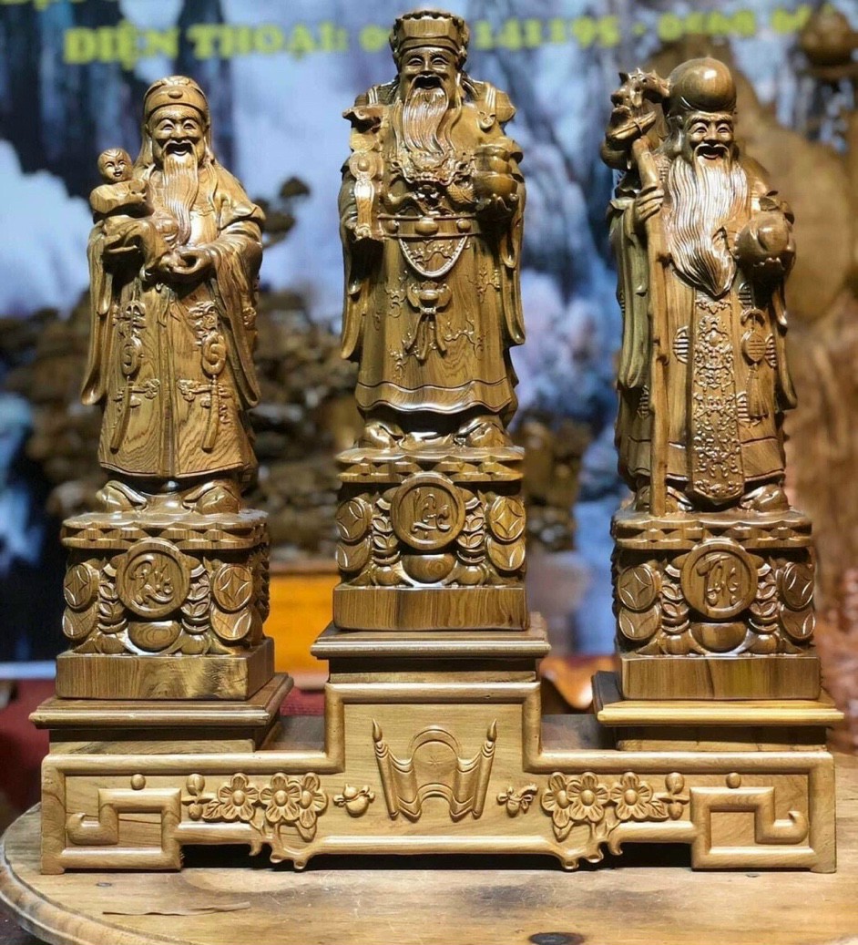 _ Bộ tam đa phúc lộc thọ được trạm khắc ,khá tinh sảo tỉ mỉ .Đi hầu hết tất cả mọi chi tiết góc ngách nội dung hoa văn của tượng đều được gọt tỉa chỉnh sửa sắc nét hoàn toàn bằng tay thủ công .Đồng thời tượng được kiểm định kỹ lưỡng khắt khe ,như cho vào thẩm sấy cho gỗ khô kiệt .Mục đích trống dập nứt vênh mo mối mọt .Kết hợp với trà nhám ,Đánh giấy giáp nhiều nước sờ mát lạnh .Rồi cho vào phun lót làm bóng mờ ,để giữ lại mầu sắc vân gỗ tự nhiên .Bộ combo tam đa phúc lộc thọ và kệ tam cấp được làm và hoàn thiện ,Do bàn tay khối óc tài hoa ,Từ những người thợ dầy rặn kinh nghiệm ,Cũng như tay nghề cao trong làng nghề truyền thống .Chính vì thế bộ tam đa phúc lộc thọ đã đáp ứnc đầy đủ mọi tiêu trí ( Đẹp bền rẻ ) Thẩm mỹ nghệ thuật với chất lượng tuyệt vời