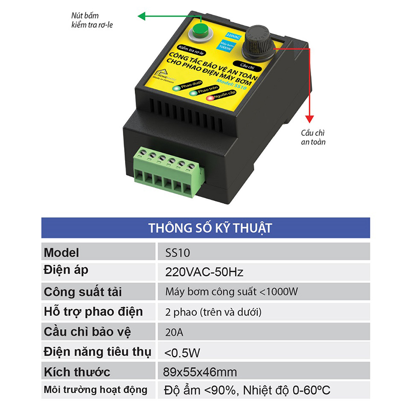 - Bảo vệ bơm: Nếu hệ thống điện lưới không ổn định do có thiết bị nào đó chập cháy, hay máy bơm bị vô nước có hiện tượng chập, hiện tượng phóng điện khiến dòng điện tăng cao…), sản phẩm được trang bị cầu chì nên sẽ cắt được nguồn điện vào rơle và máy bơm tránh sự cố gây hư hại nặng hơn.