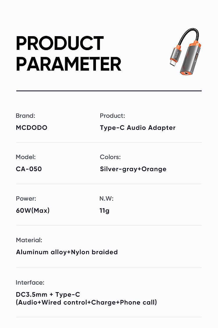 | Tên | Đầu Chuyển Đổi Type-C Sang DC3.5 Mcdodo Oryx Series Type-C to Type-C and DC3.5mm cable (60W PD) |