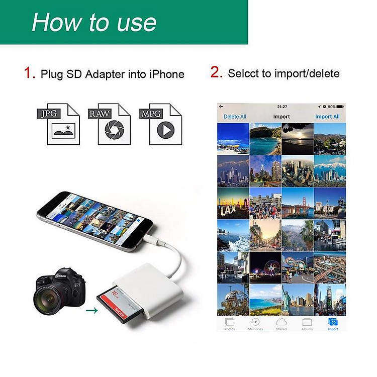 Plug and Play: Không cần tải ứng dụng (chỉ cắm và chạy) Tự động mở ứng dụng Ảnh khi được kết nối với máy ảnh hoặc thẻ nhớ, hỗ trợ định dạng hình ảnh JPEG / RAW / HEIF / HEVC và định dạng video H.264 / MPEG-4. (đối với ảnh thẻ nhớ và video cần nằm trong thư mục DCIM)