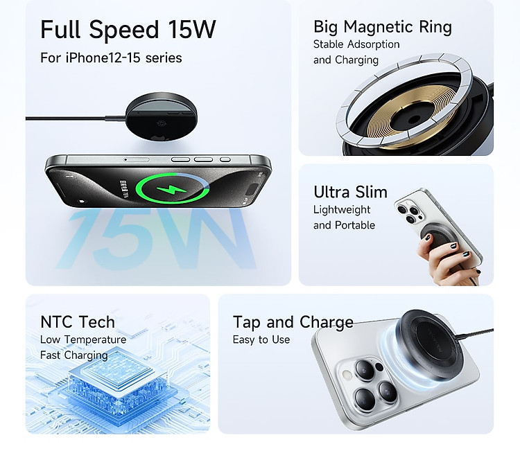 • Sạc Không Dây 15W: Sử dụng công nghệ sạc không dây tiên tiến, sản phẩm cung cấp khả năng sạc nhanh với công suất lên đến 15W, giúp bạn sạc nhanh và hiệu quả các thiết bị của mình.