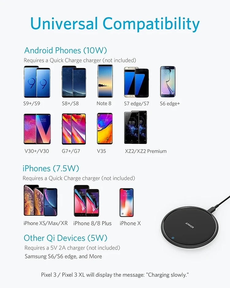 Công nghệ tiên tiến phát hiện các thiết bị tương thích sạc không dây của bạn, cung cấp tới 7.5W cho iPhone và 10W cho Samsung. (Sử dụng sạc hỗ trợ Qualcomm Quick Charge 2.0 hoặc 3.0 - Sản phẩm này không bán kèm sạc).