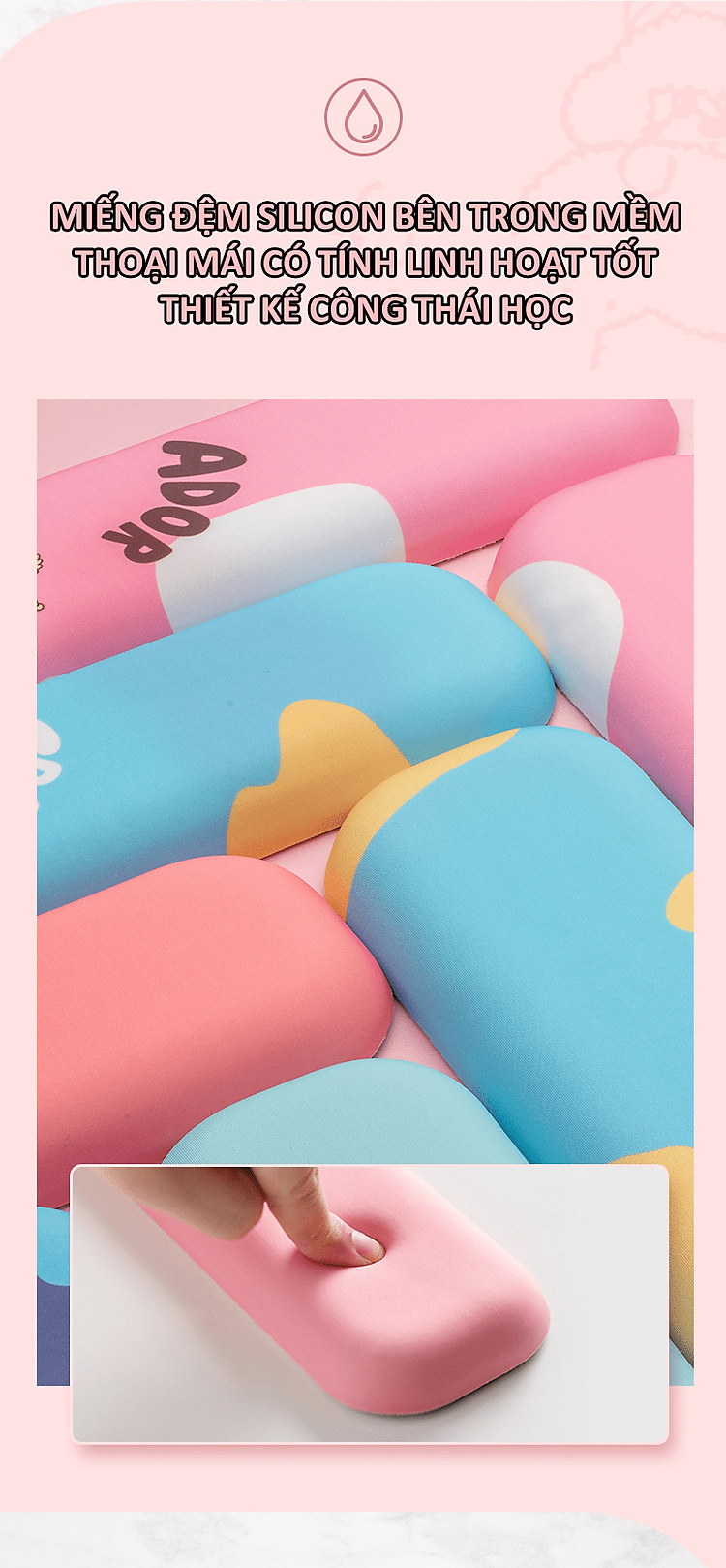 - Bề mặt miếng kê tay cực kỳ êm ái, thích hợp cho các bạn hay dùng bàn phím vi tính, bàn phím máy tính bàn, chống đau cổ tay.