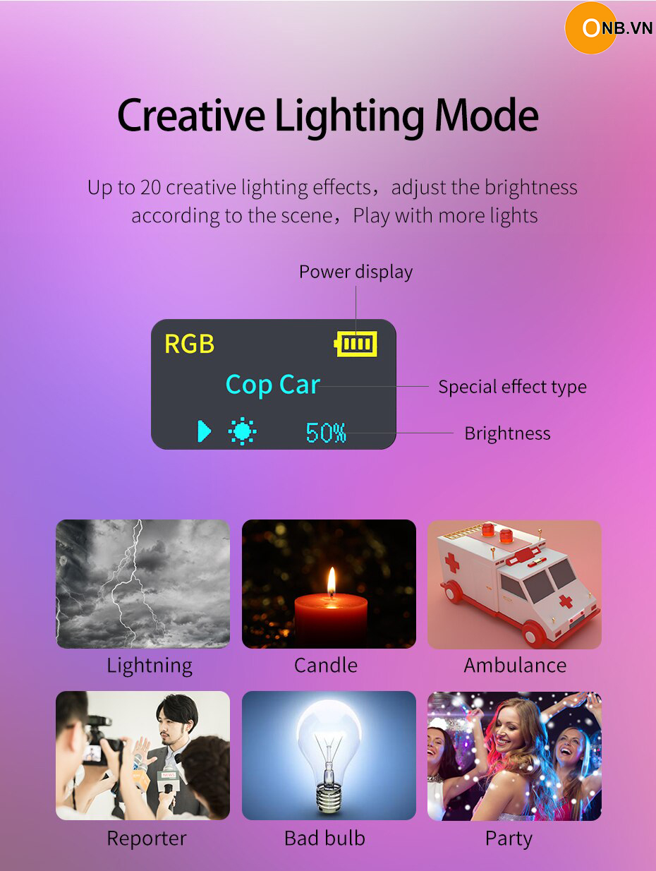 Điều chỉnh được 20 hiệu ứng anh sáng, đi kèm sáng phẩm là bao silicon cho ánh sáng mịn hơn, và 1 lưới tổ ông cho ánh sáng chuẩn nhất.