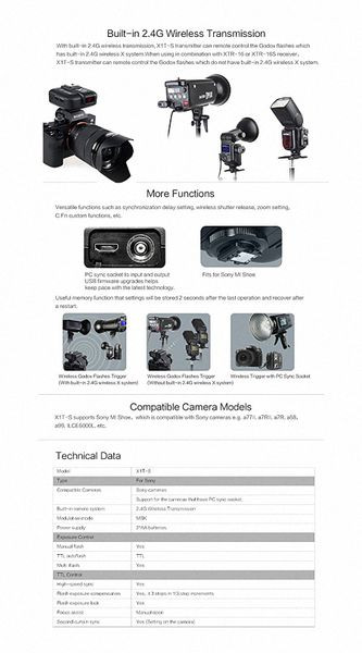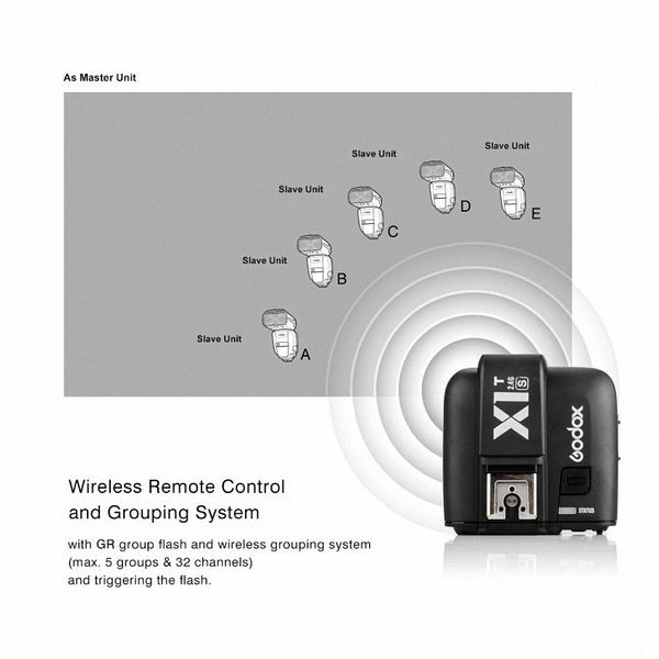- Nó có thể được sử dụng để kích hoạt màn trập máy ảnh, đèn studio và đèn flash, X1T tương thích với các máy ảnh trên thị trường có hỗ trợ đồng bộ E - TTL II.