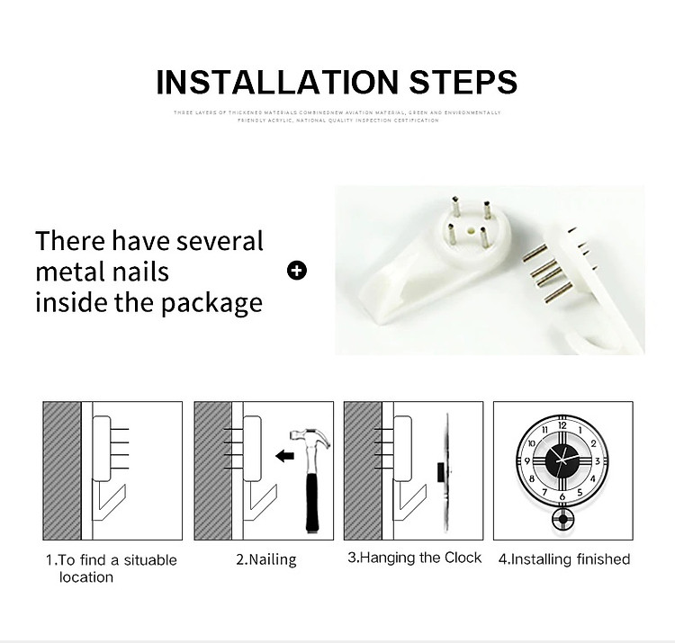 Nếu bạn đang lo ngại sản phẩm đồng hồ treo tường quả lắc khó lắp đặt, khó khăn trong việc khoan tường để treo đồng hồ và có thể làm hư hại tường nhà bạn. Xin bạn yên tâm, sản phẩm đồng hồ được thiết kế để dể dàng treo lên tường với móc dán chịu lực được kèm theo bên trong sản phẩm.