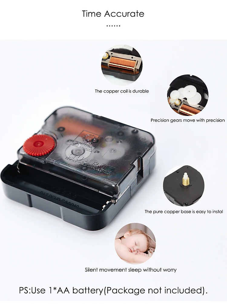 Bên cạnh việc sử dụng acrylic cao cấp của đài Loan để chế tác ra mặt đồng hồ treo tường, chúng tôi còn trang bị máy đồng hồ kim trôi và máy dao động con lắc cao cấp, được nhập khẩu từ đài loan. Giúp cho sản phẩm vận hành êm ái, không gây tiếng ồn vào ban đêm ảnh hưởng đến giấc ngủ của bạn và gia đình.