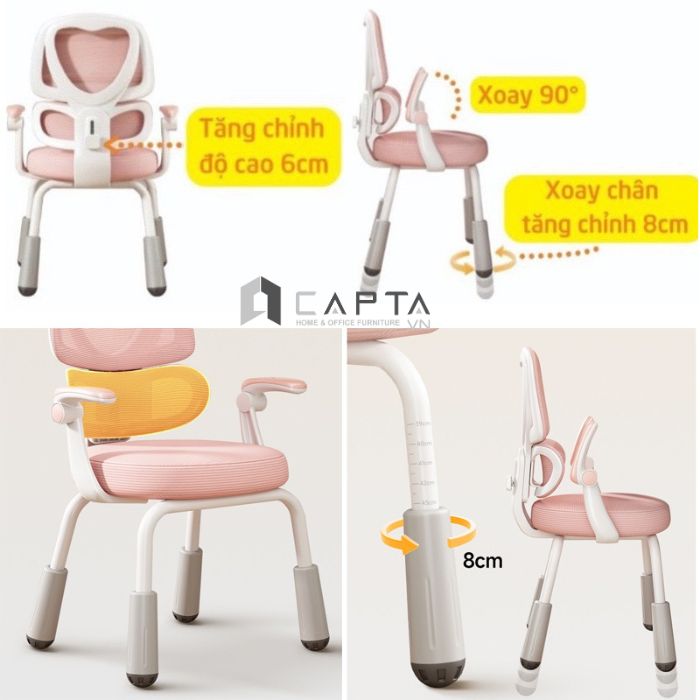 Ghế lưng lưới thoáng khí hạn chế hầm bí khi ngồi, bọc nệm vải gồm ba màu xanh, xám, hồng phổ biến, thích hợp cho cả bé trai và bé gái.