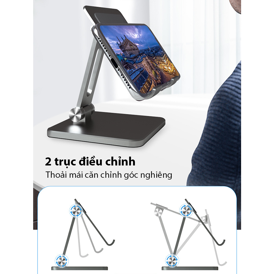 Giới thiệu Giá Đỡ Để Bàn Khung Hợp Kim Nhôm Cao Cấp Cho iPad, Máy Tính Bảng, Điện Thoại Di Động - Hai Trục Xoay 180 Độ Linh Hoạt, Đệm Chống Trượt Điện Thoại, Chống Đổ