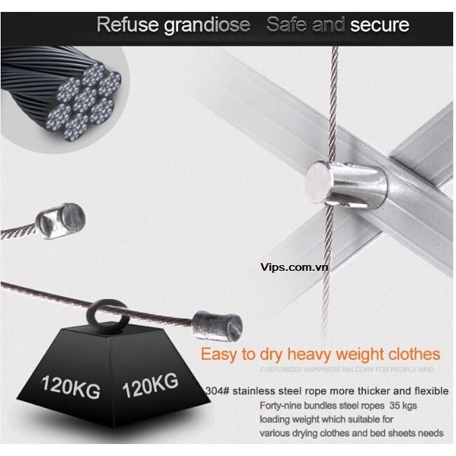 1. Chất liệu: Nhôm Hợp Kim Hàng Không vô cùng sang trọng, không gỉ, không phai màu, cáp lụa inox 1.8li không rỉ, không co dãn .