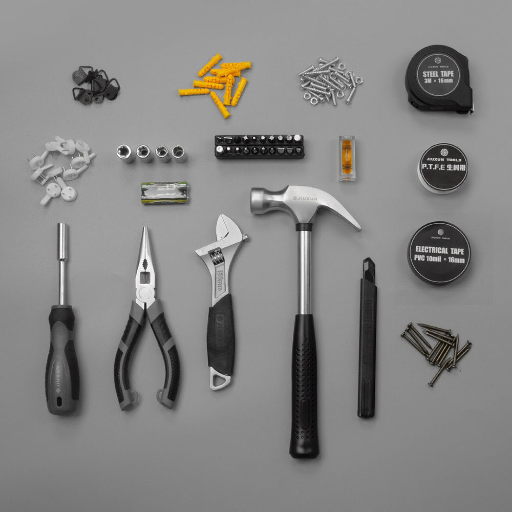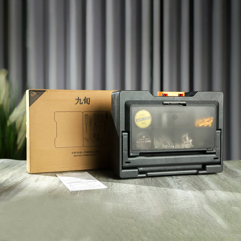 Điểm độc đáo của bộ dụng cụ đa năng cầm tay Jiuxun Tools đó là tích hợp đến 166 món đồ trong cùng một sản phẩm, giúp người dùng dễ dàng tìm được công cụ phù hợp để tháo lắp và sửa chữa các thiết bị gia dụng trong gia đình. Bộ sản phẩm được ra mắt lần này sẽ bao gồm: Thước cuộn 3m, dao rọc giấy, kìm, búa, cờ lê, tuốc nơ vít, đầu khẩu 7.8.9.10, thước cân thủy, 1 cuộn băng keo và 1 cuộn băng keo cách điện, 2 cục pin, cùng 130 phụ kiện hỗ trợ thiết thực khác.
