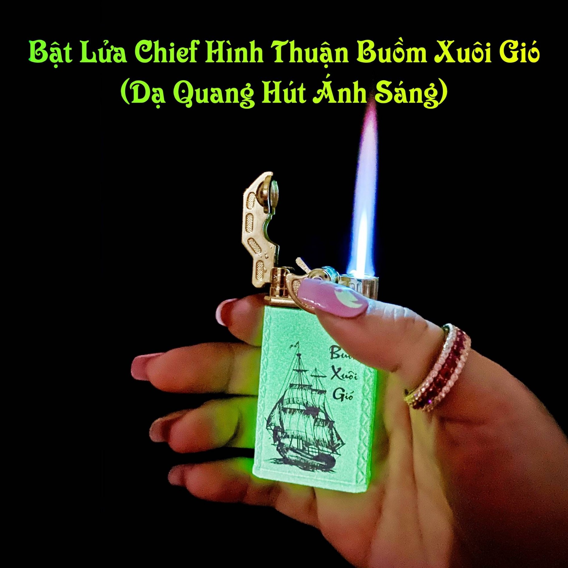 Hộp quẹt bật lửa khè Chief búng tay đánh lửa dạ quang hút ánh sáng hình thuận buồm xuôi gió - (xài gas)