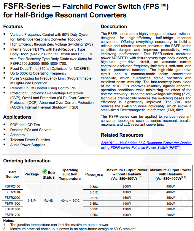 | Kích thước | Thông số kỹ thuật:Mã sản phẩm: FSFR1800XSKiểu chân: 9-SDIP 9 chânCông suất: 120W (không tản nhiệt); 260W (có tản nhiệt) |