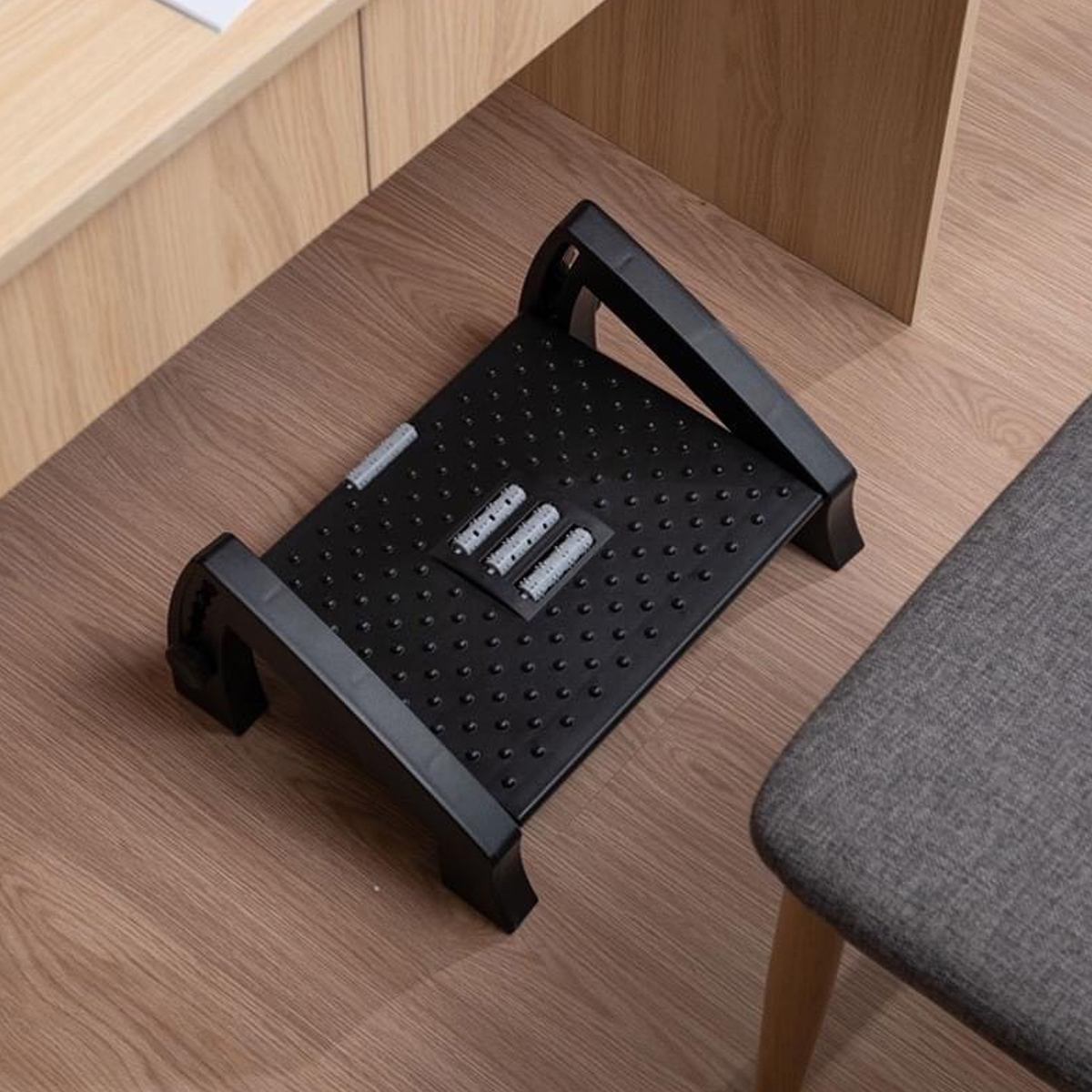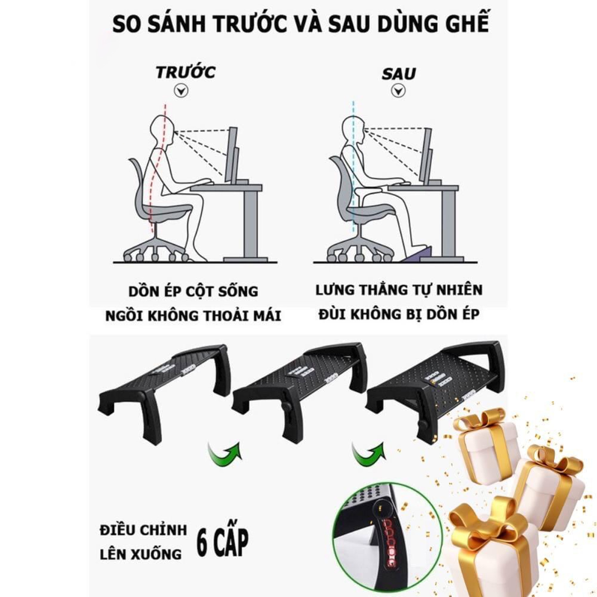 Đặc biệt, giá kê chân công thái học có thiết kế hình chữ L, giúp đặt chân vào vị trí tự nhiên, giảm thiểu áp lực và căng thẳng trên đùi và khớp chân. Sản phẩm này còn có tính năng điều chỉnh độ cao, cho phép người dùng tùy chỉnh giá trị cao/thấp để phù hợp với chiều cao của mình.