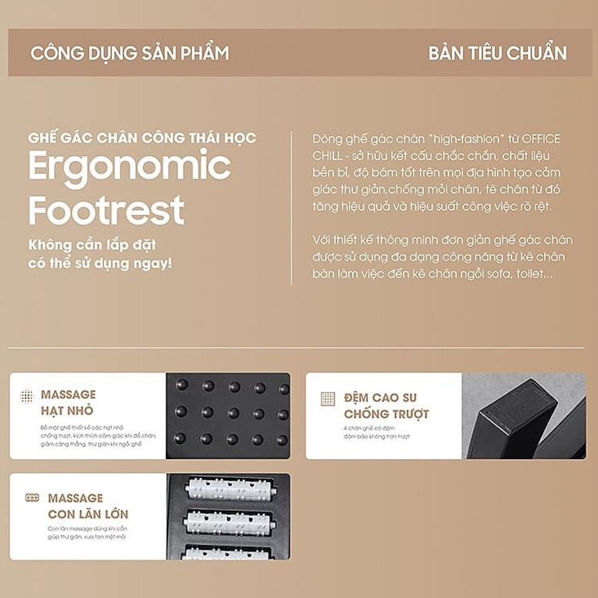Giá kê chân công thái học là một sản phẩm được thiết kế để giảm đau và mệt mỏi ở chân khi phải ngồi lâu trên ghế văn phòng. Được chế tạo bằng chất liệu nhựa ABS cao cấp, giá kê chân công thái học có độ bền cao và khả năng chịu lực tốt.