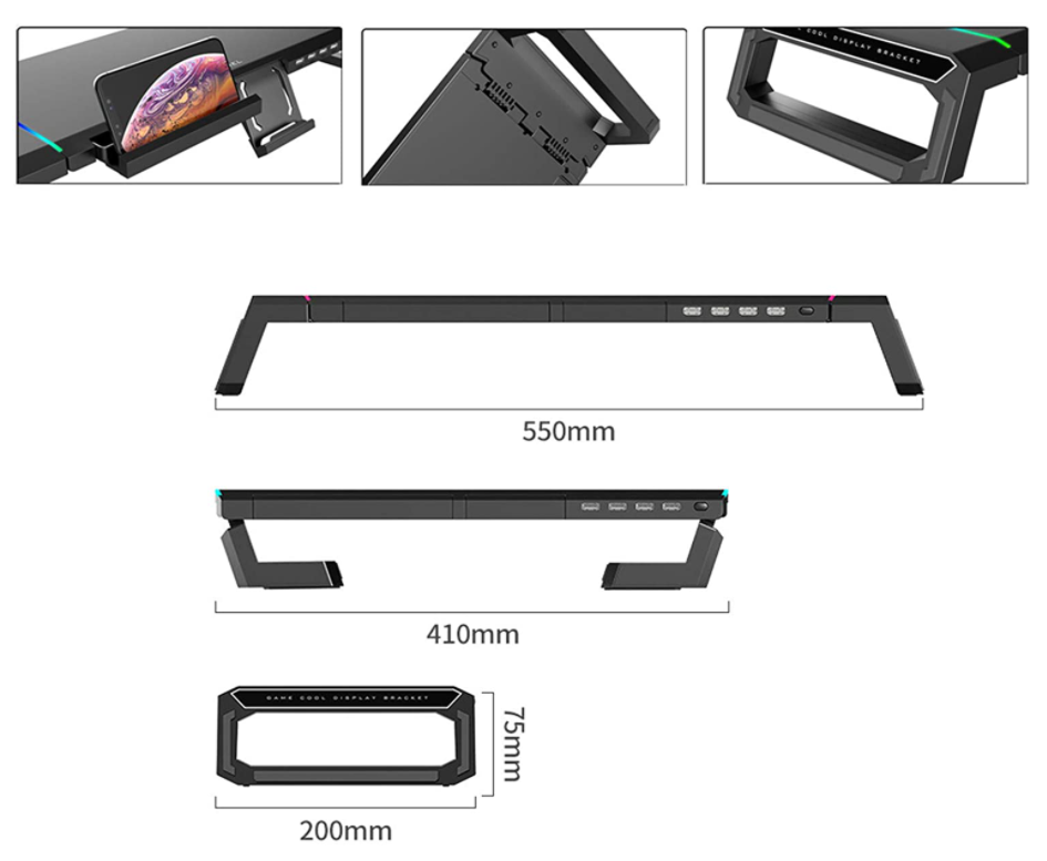 Tên sản phẩm: Kệ nâng cao máy tính đa chức năng với đèn chiếu sáng RGB và 4 cổng USB 3.0, Giá đỡ màn hình có thể gập lại, tải 30kg / 66Ib