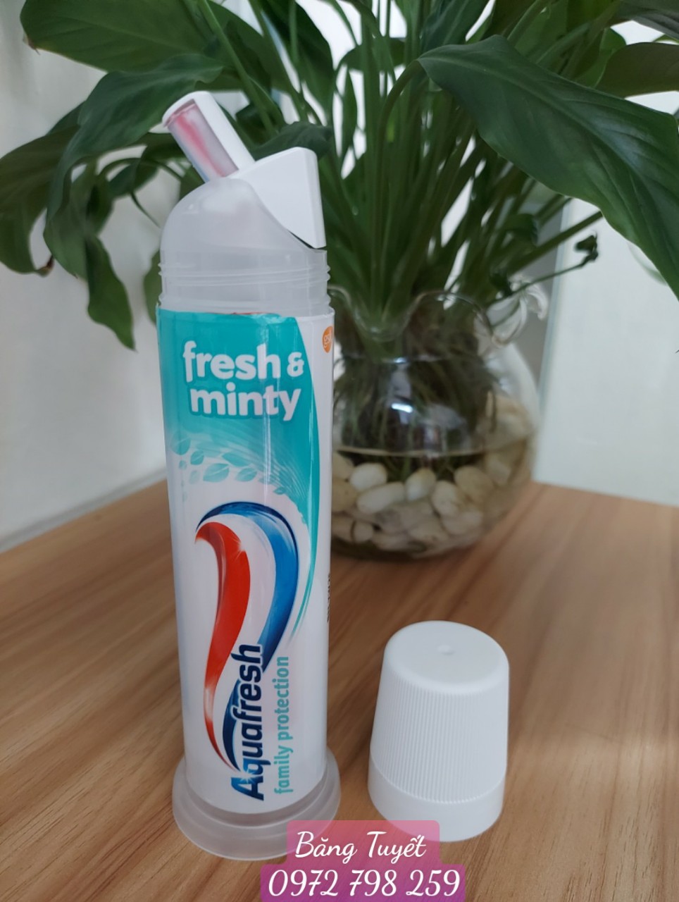 ⇨ Kem đánh răng Aquafresh Family Protection Fresh and Minty với công thức đột phá gấp 3 lần, giúp làm sạch răng miệng, loại trừ mảng bám hiệu quả, đồng thời làm trắng răng và mang lại hơi thở thơm tho dễ chịu.