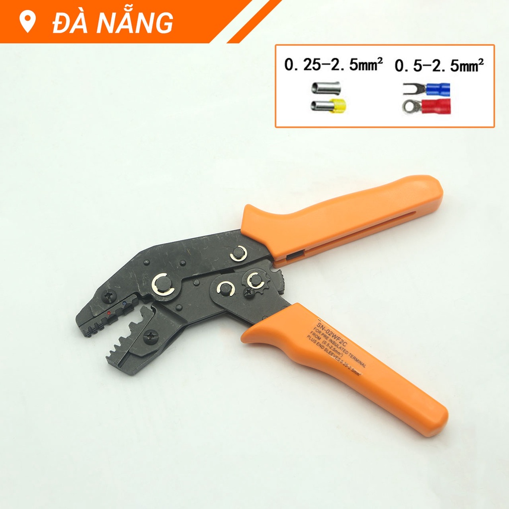 Kìm bấm cos SN-02WF2C có thể bấm cos tròn và cả cos pin rỗng với dây Φ 0.5 - 1.6 thiết diện sau khi bấm 0.25-2.5 mm² hay dây đồng với chỉ số Mỹ 24-14 AWG.