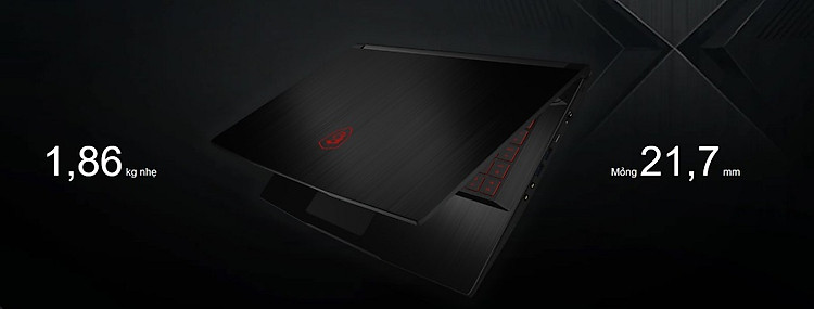 MSI GF63 THIN 11UD được thiết kế có mặt trên máy được làm bằng kim loại chắc chắn và nắp bàn phím được ghép nối độc đáo, thiết kế mỏng nhẹ đến bất ngờ đối với một dòng gaming chỉ mỏng 21,7mm. Bên cạnh đó còn có thiết kế thông gió hình chữ X ẩn ở dưới máy tạo nên 1 điểm bật đầy thu hút.