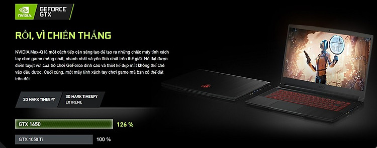 Vì là một chiếc máy gaming chính hiệu nên MSI GF63 Thin 11UD 628VN được trang bị GPU NVIDIA Max-Q giúp tạo ra một chiếc laptop gaming mỏng nhất, nhanh nhất và yên tĩnh nhất trên thế giới. Nó đạt được điểm tuyệt đối khi chơi các tựa game đỉnh cao và thiết kế đẹp mắt không thể chê. Đây là một chiếc máy gaming thuận tiện để bạn mang theo khi di chuyển và cực nhẹ để đặt lên đùi.