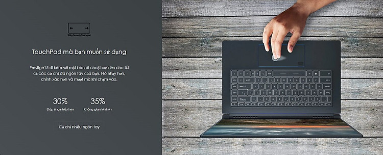 Msi prestige i7 có touchpad cực lớn, lớn hơn 35% mẫu touchpad thông thường, và có khả năng phản hồi nhanh hơn 30%. Từ đó bạn có thể thao tác dùng nhiều ngón tay hoạt động cùng lúc trên bề mặt.