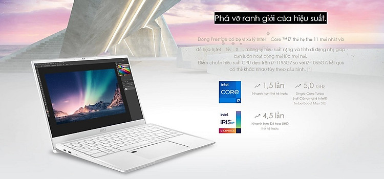 Msi prestige evo 14 được trang bị bộ vi xử lý Intel Core i7-1185G7 thế hệ thứ 11 mới nhất nhanh gấp 1,5 lần so với thế hệ thứ 10 và tốc độ xử lý lên đến 5.0GHz. Đồng thời có đồ họa Intel Iris Xe vượt trội hơn 4,5 lần đồ họa UHD tiền nhiệm. Với hai cấu hình trên sẽ mang lại một chiếc laptop có hiệu năng mạnh mẽ kết hợp với tính di dộng cao giúp người dùng có thể luôn mang theo bên mình để làm việc và giải trí mọi lúc mọi nơi.
