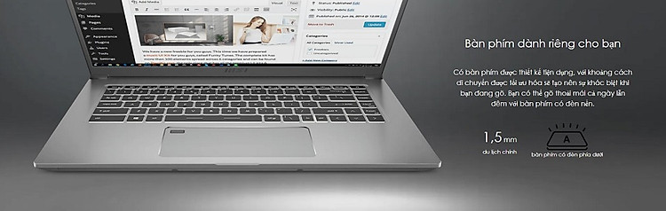 Để mang lại trải nghiệm đánh máy tuyệt vời, msi prestige 14 a11 được sản xuất với thiết kế bản lề 5 độ đặc biệt, có thể tự động nghiêng bàn phím ở góc đánh máy tốt nhất. Hành trình phím 1,5mm được tối ưu hóa giúp đánh máy thoải mái và chính xác hơn. Các phím được thiết kết theo sự tính toán tỉ mỉ và khoa học để tối ưu hóa khoảng cách di chuyển giữa các đầu ngón tay, từ đó tạo nên sự khác biệt khi bạn nhập liệu.