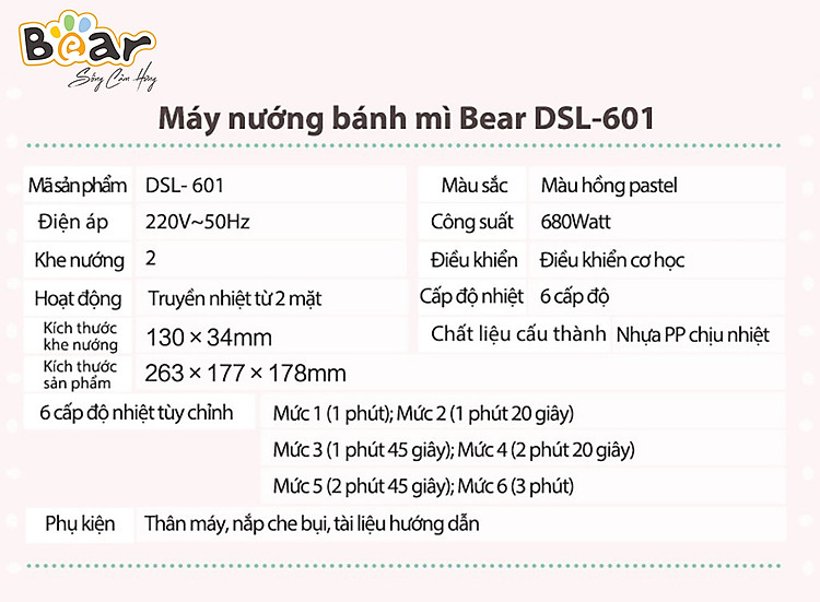 Lò / Máy Nướng Bánh Mì Bear Công Suất 680W Với 2 Khe Nướng, 6 Cấp Độ - Hàng Chính HãngChuẩn bị bữa sáng cho cả gia đình dễ dàng hơn với máy nướng bánh mì Bear DSL-601 thiết kế 2 khe nướng với 6 mức đ...