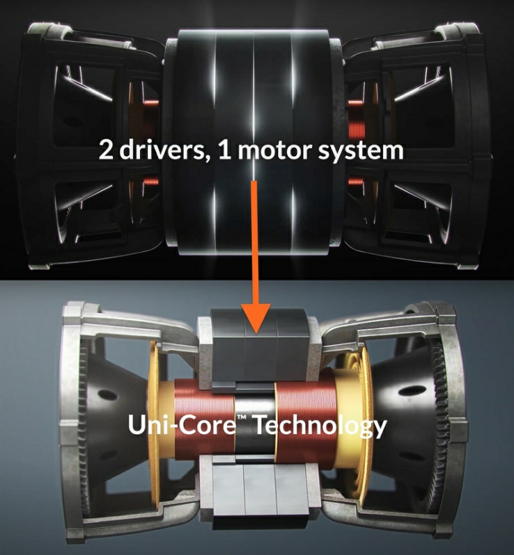 Uni-Core mang lại hiệu suất chưa từng có thông qua sự kết hợp của cấu hình triệt tiêu lực và hệ thống từ đơn đột phá. Cụ thể hơn, Uni-Core chính là một cặp loa woofer đối xứng với 2 cuộn voice coil được bố trí đồng tâm (một cuộn lớn, một cuộn nhỏ lồng vào nhau) và dùng chung một hệ thống nam châm duy nhất.