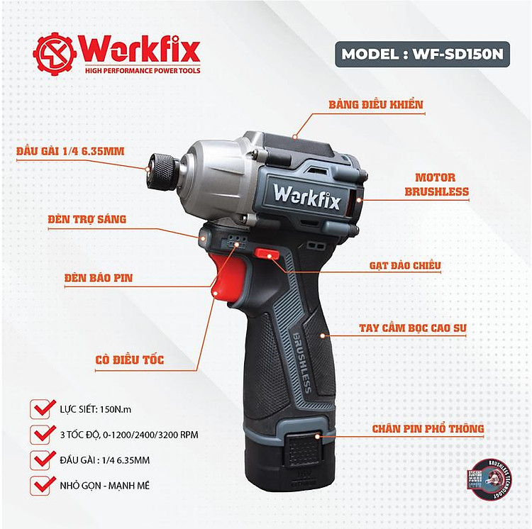 Máy Bắn Vít Workfix 150N.m - 3 Tốc Độ - Động Cơ Từ - 2 Pin 16.8V/2Ah - Đầu 1/4 - Nhỏ Gọn Chuyên Dùng Làm Nhôm Kính, Làm Mộc, Nội Thất...