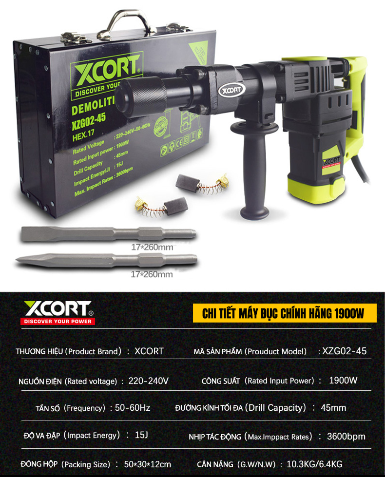 Máy đục bêtông XCORT với công suất lớn nhất thị trường hiện nay 1.800W giúp bạn giải quyết nhanh gọn những tấm bêtông cứng đầ