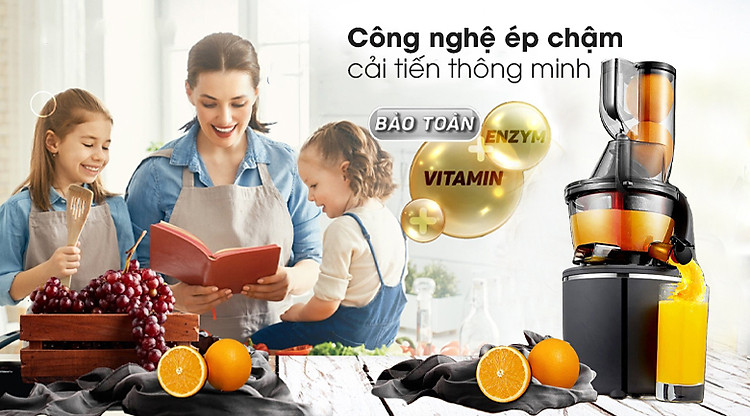 Công nghệ ép chậm bảo toàn được Vitamin, Enzym gấp 4 lần so với các máy ép chậm thông thường khácCông nghệ ép chậm được cấp bằng sáng chế J.M.C.S với tốc độ ép 55 vòng/phút sẽ hạn chế quá trình oxy ...
